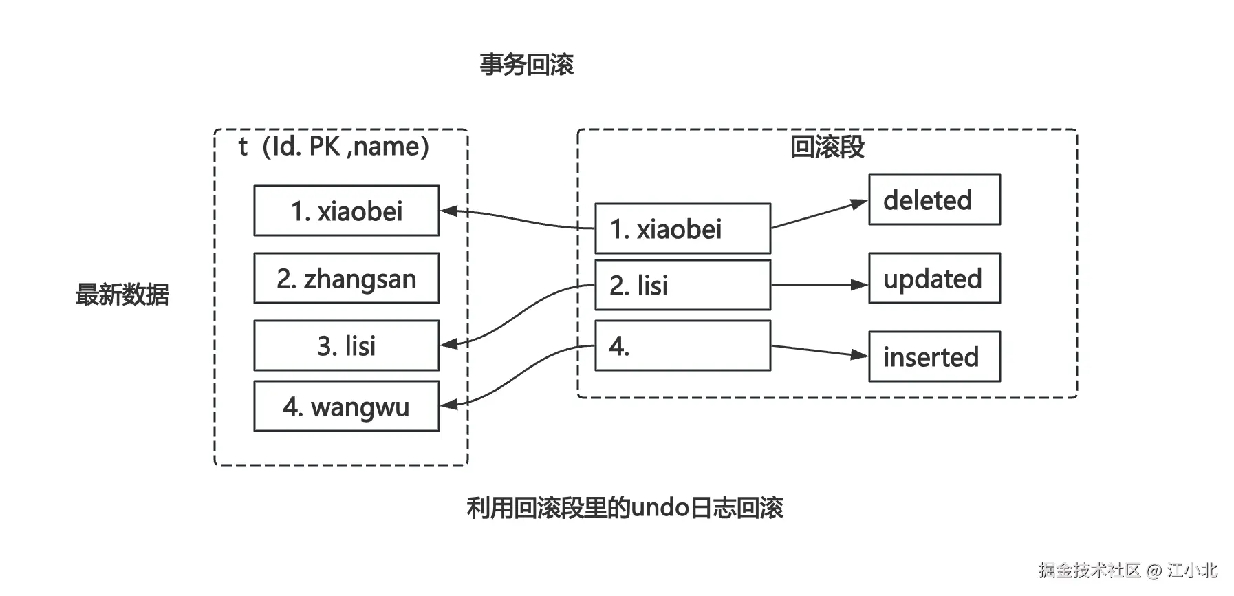 具体来说,insert操作的undo记录新数据的主键,delete和update的undo记录完整的旧数据行。回滚时直接用这些旧版本恢复就行。