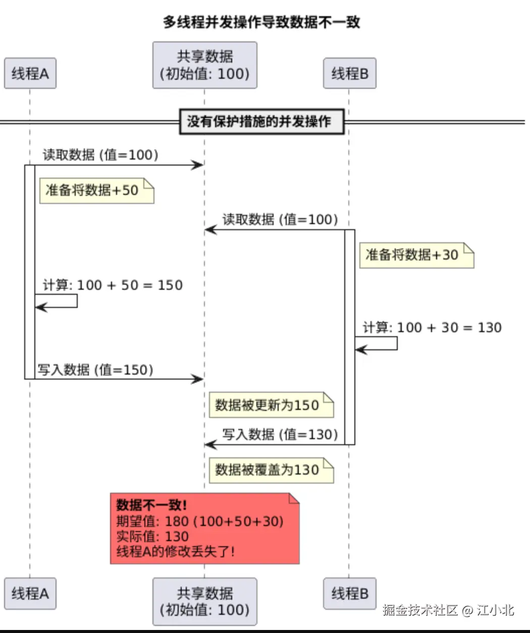 多个请求同时对同一条数据进行操作。如果没有任何保护措施,结果会是混乱的------某个线程还在修改数据,另一个线程已经开始读取,最后导致数据不一致。