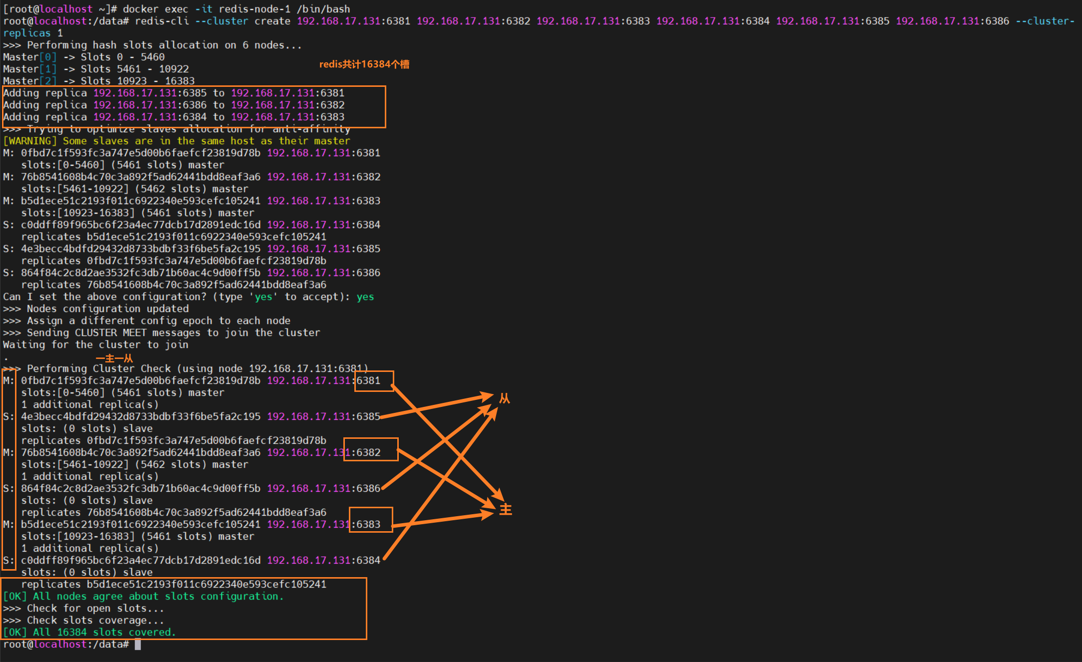 redis-cli --cluster create 192.168.17.131:6381 192.168.17.131:6382 192.168.17.131:6383 192.168.17.131:6384 192.168.17.131:6385 192.168.17.131:6386 --cluster-replicas 1