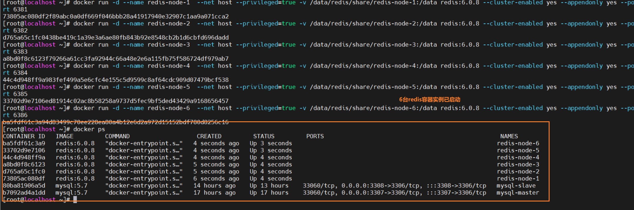 docker run -d --name redis-node-4 --net host --privileged=true -v /data/redis/share/redis-node-4:/data redis:6.0.8 --cluster-enabled yes --appendonly yes --port 6384