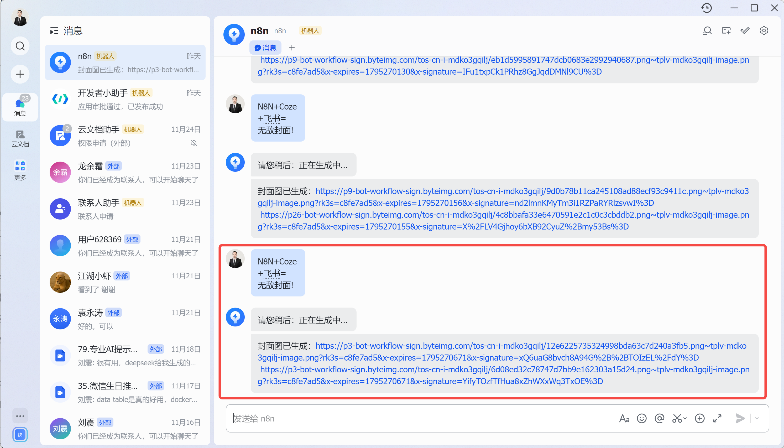 这个系统的使用简直不要太简单!我只需要在飞书里输入想要生成的封面文字,比如"N8N+Coze+飞书=无敌封面",敲个回车,不到 2 秒钟,系统就会自动生成两张高清封面图: