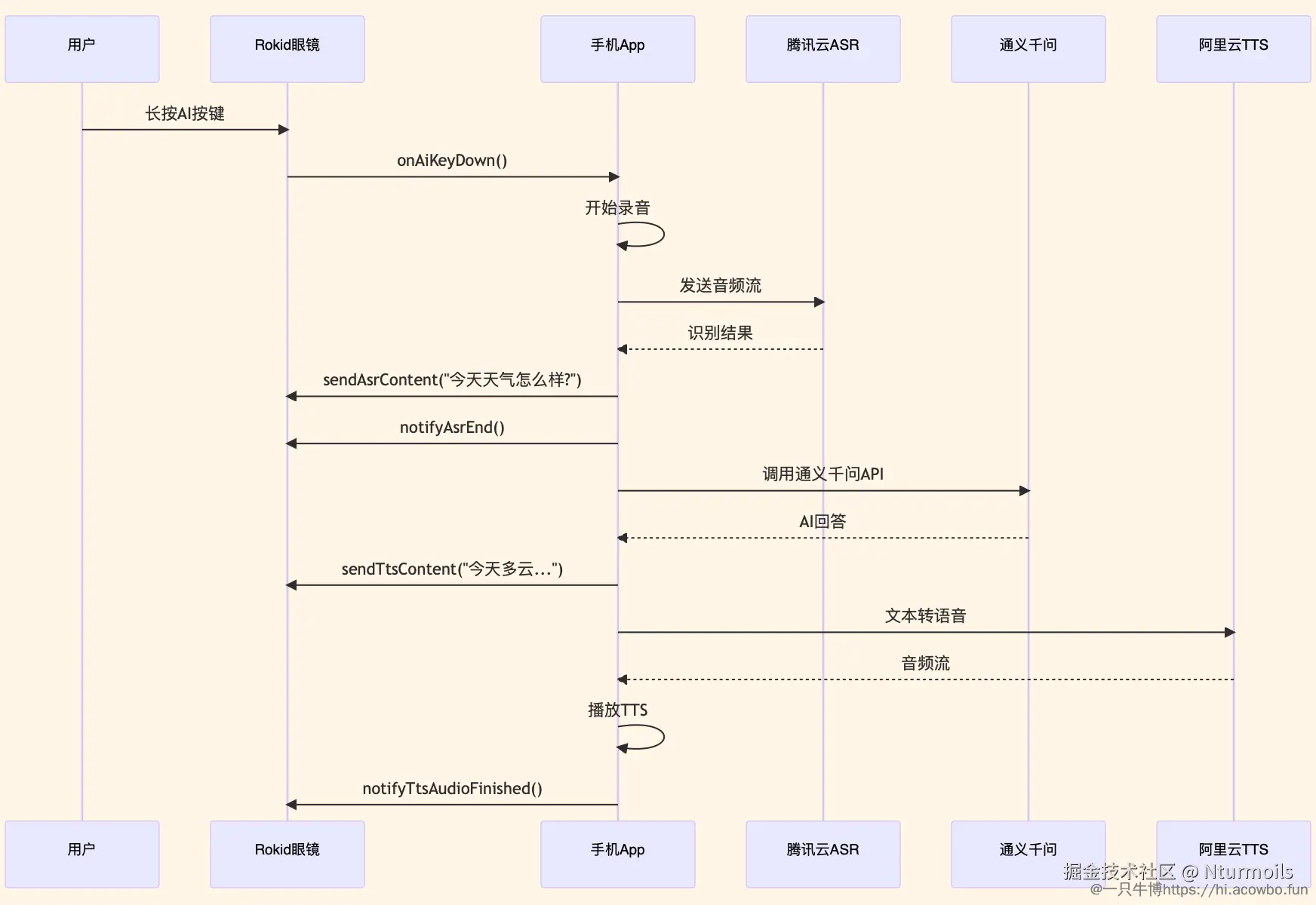 整个流程的关键路径:用户触发 → 语音识别 → AI推理 → 结果推送 → 眼镜显示。