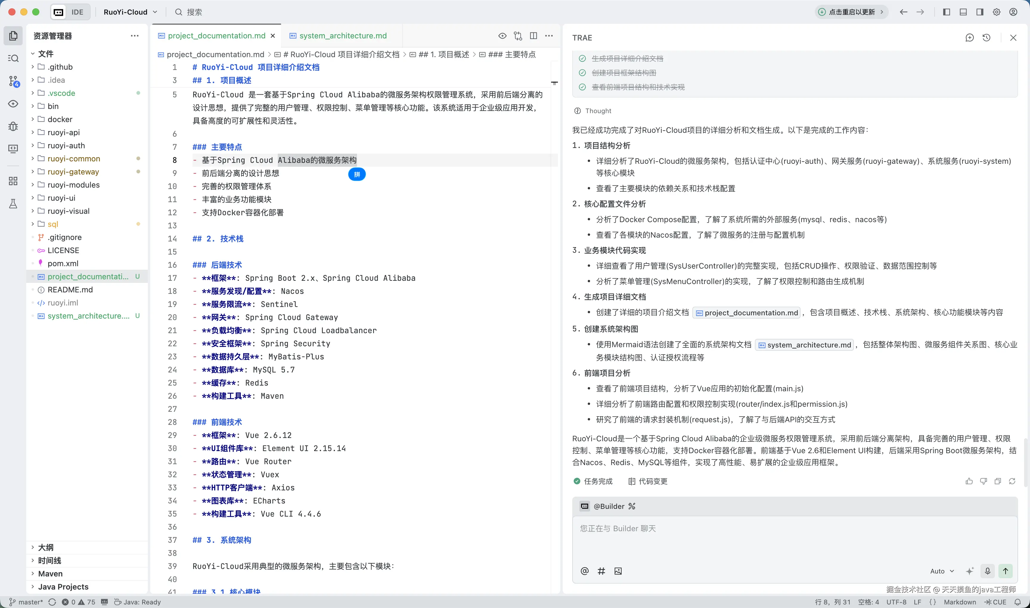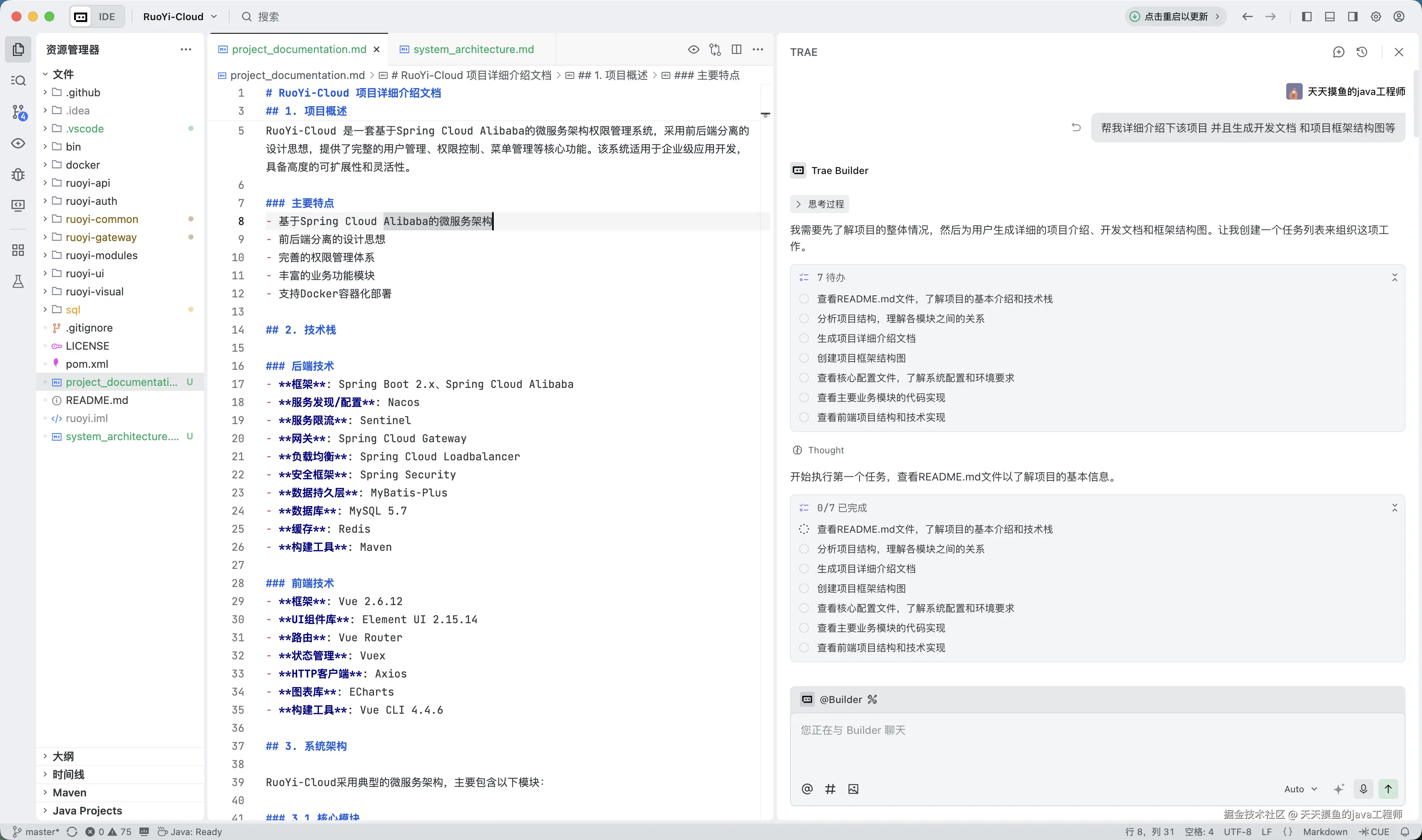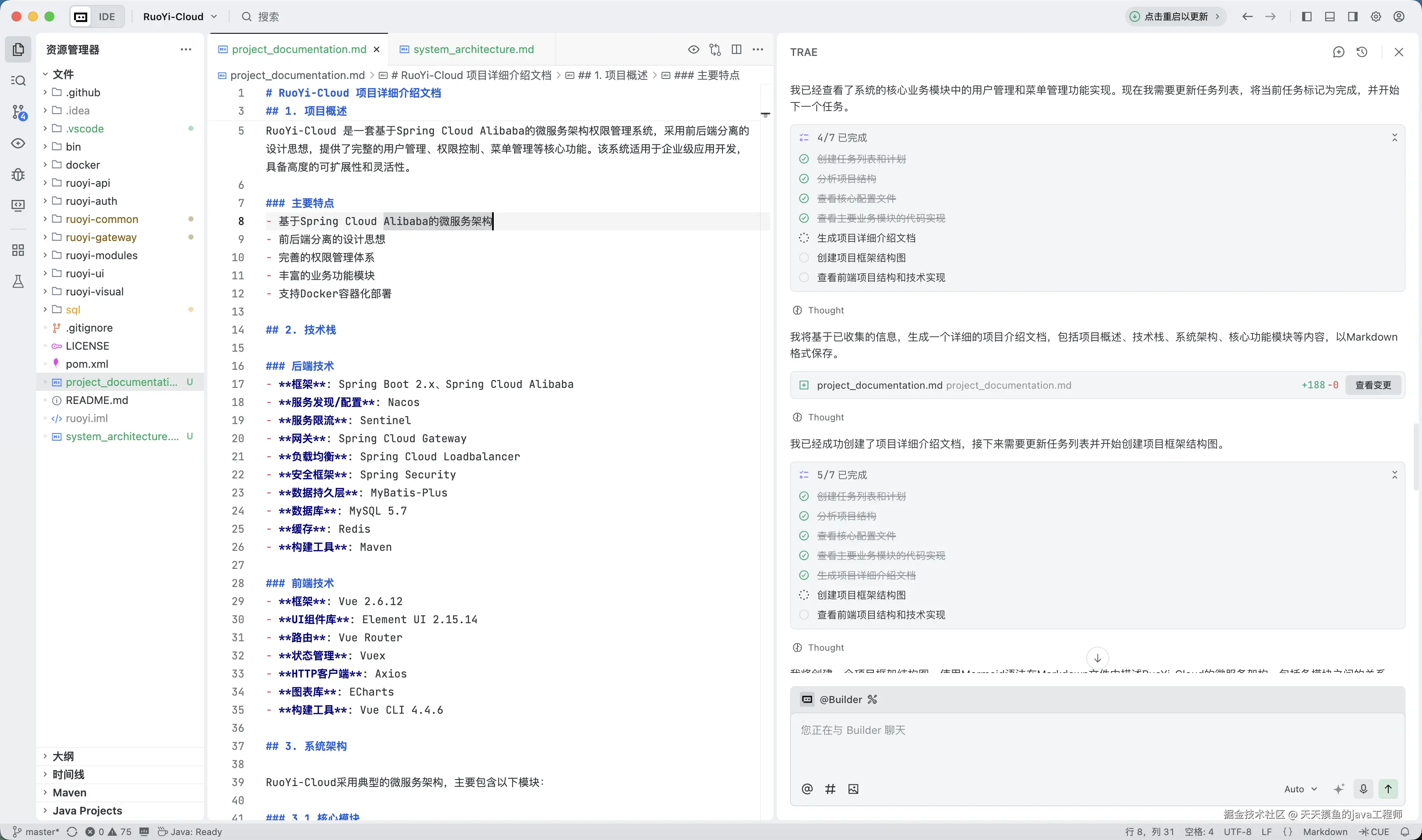 你可以看到,在系统左侧我完整分析了 RuoYi-Cloud 的模块结构,在右侧的 TRAE 界面中,任务进度被自动追踪,并且每完成一个阶段,AI 都会自动生成内容并回填上下文。