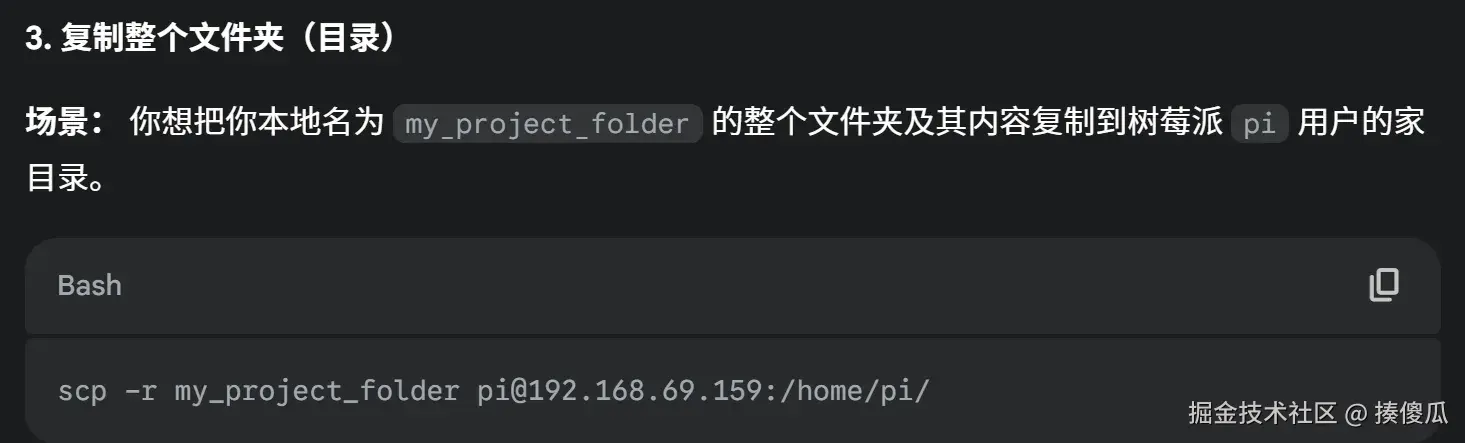 若想要传文件(文件夹见第13点)从电脑到树莓派,使用: