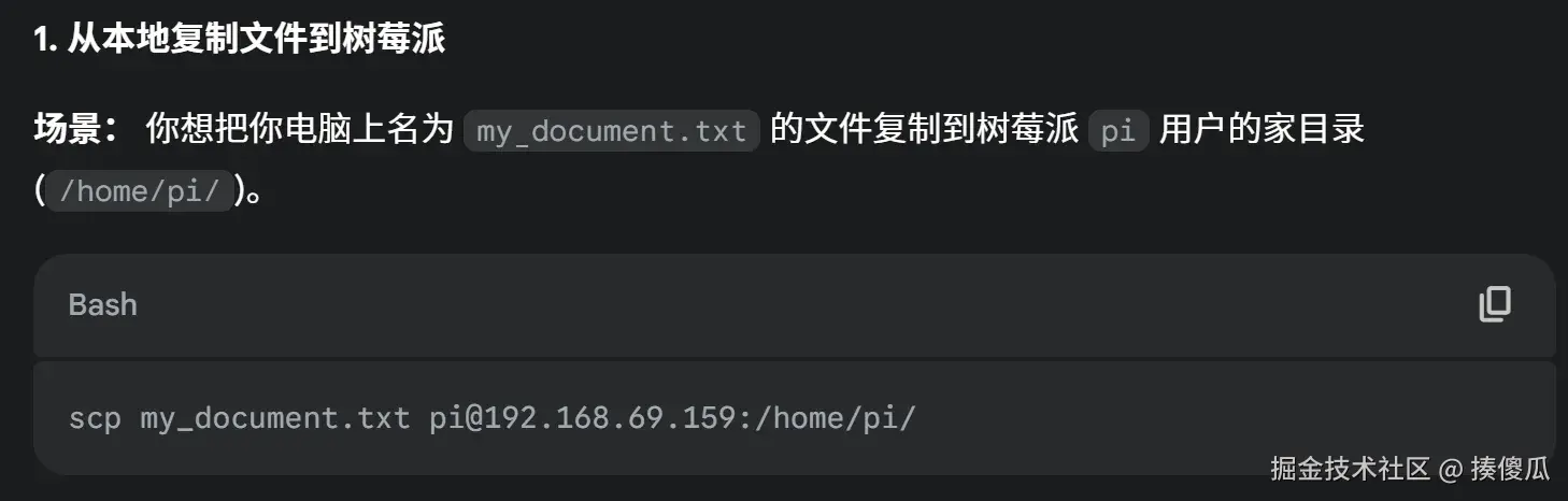 scp 电脑文件地址 (hostname)@(IP)树莓派文件地址,如下图