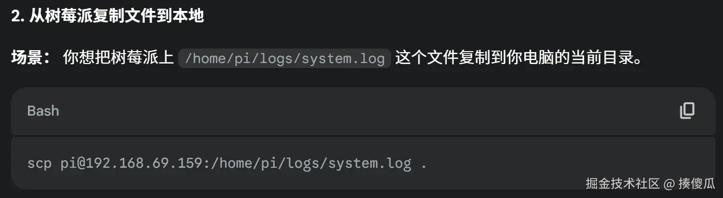 scp (hostname)@(ip)树莓派文件地址 电脑文件地址,如下图