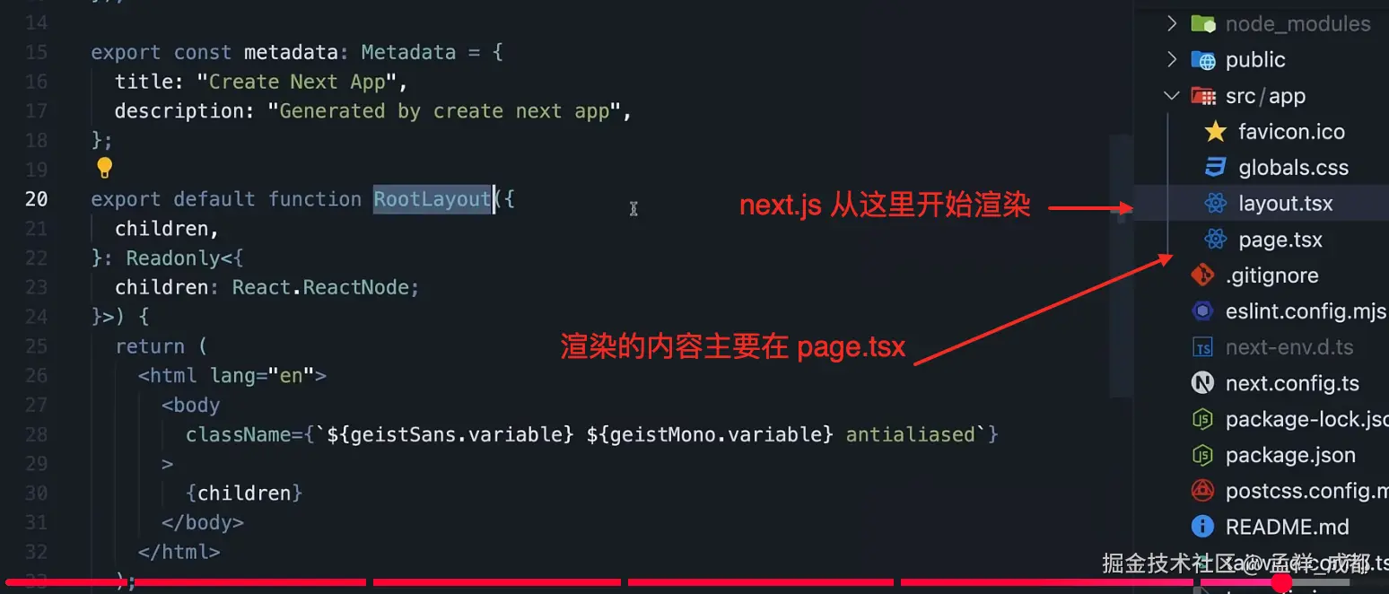 服务器从根布局 layout.tsx 开始渲染(也就是 app 下的 layout 文件开始渲染 )。虽然是从 layout.tsx 渲染,但 layout.tsx 主要作用是共享 UI,也就是例如头部导航栏所有组件一般都会用到,所以 layout.tsx 里面的代码会共享给所有组件,但如果你只看当前路由渲染的内容,是在 page.tsx 文件中。