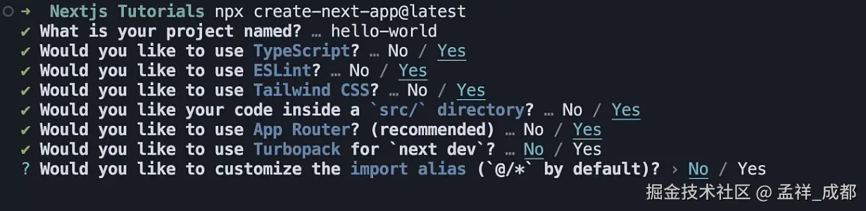 npx create-next-app@latest- 然后会让你输入项目名称,你可以直接回车默认,也可以输入你喜欢的名称。
