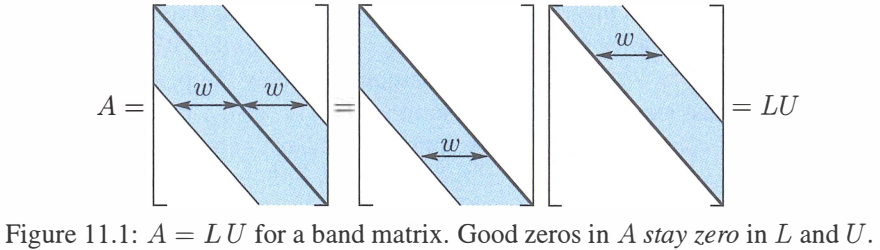 如果矩阵 AAA 有 "优质零元素" 的话,计算次数能够显著减少。优质零元素就是从 AAA 消元得到 LLL 和 UUU 的过程中,它所在的位置仍然为零。最佳的零元素是在一行的开头 ,此时这一行就不需要消元,因为乘数为零,所以它对应矩阵 LLL 的位置仍然为零。对于三对角矩阵(tridiagonal matrix)AAA (还有 Figure 11.1 中的带状矩阵)这种特征尤为明显:三对角矩阵=(两对角矩阵)×(两对角矩阵)Tridiagonal=Bidiagonal× Bidiagonal[1−1−12−1−12−1−12]=[1−11−11−11][1−11−11−11]{\color{blue}三对角矩阵=(两对角矩阵)×(两对角矩阵)}\\{\color{blue}\textrm{Tridiagonal\kern 7pt=\kern 7ptBidiagonal\kern 7pt}\times\,\textrm{Bidiagonal}}\\[1ex]\begin{bmatrix}\kern 7pt1&-1\\-1&\kern 7pt2&-1\\&-1&\kern 7pt2&-1\\&&-1&\kern 7pt2\end{bmatrix}=\begin{bmatrix}\kern 7pt1\\-1&\kern 7pt1\\&-1&\kern 7pt1\\&&-1&1\end{bmatrix}\begin{bmatrix}1&-1\\&\kern 7pt1&-1\\&&\kern 7pt1&-1\\&&&\kern 7pt1\end{bmatrix}三对角矩阵=(两对角矩阵)×(两对角矩阵)Tridiagonal=Bidiagonal×Bidiagonal 1−1−12−1−12−1−12 = 1−11−11−11 1−11−11−11