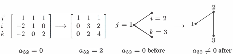 在研究这种零元变为非零元的现象时,我们只需要非零元的位置信息,而并不需要它确切的值。考虑上图中非零元:aij≠0a_{ij}\neq0aij=0 表示节点 iii 和节点 jjj 相连。注意,消元法会产生非零元(新边),这也是要克服的问题。