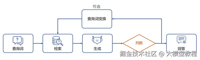 一个典型的线性RAG流模式是:"重写-检索-阅读(Rewrite-Retrieve-Read,RRR) "方法。该方法在预检索阶段引入了一个查询重写模块。这个模块基于 T5-large 模型的微调版本,并通过强化学习框架进行优化,将查询重写过程建模为 马尔可夫决策过程(MDP) 。