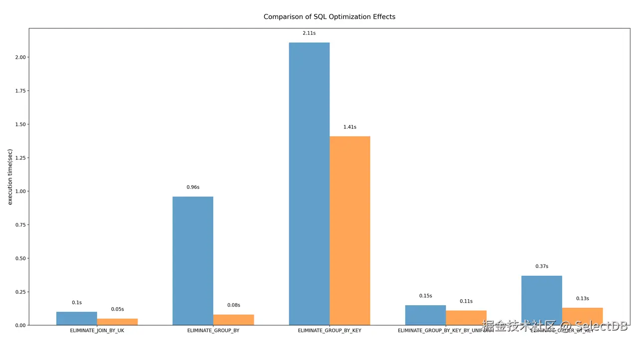 在关闭 ELIMINATE_GROUP_BY 优化时,执行时间为 0.96sec, 在开启 ELIMINATE_GROUP_BY 优化时, SQL 的执行时间是 0.08sec, 性能提升了 1100%。