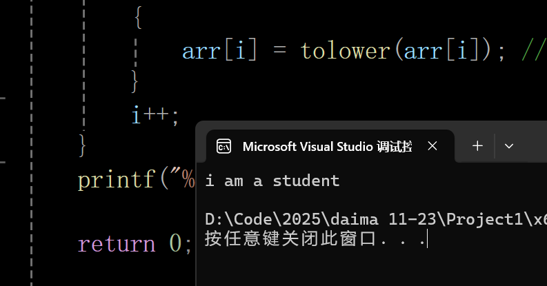 int tolower ( int c ); //将参数传进去的⼤写字⺟转⼩写