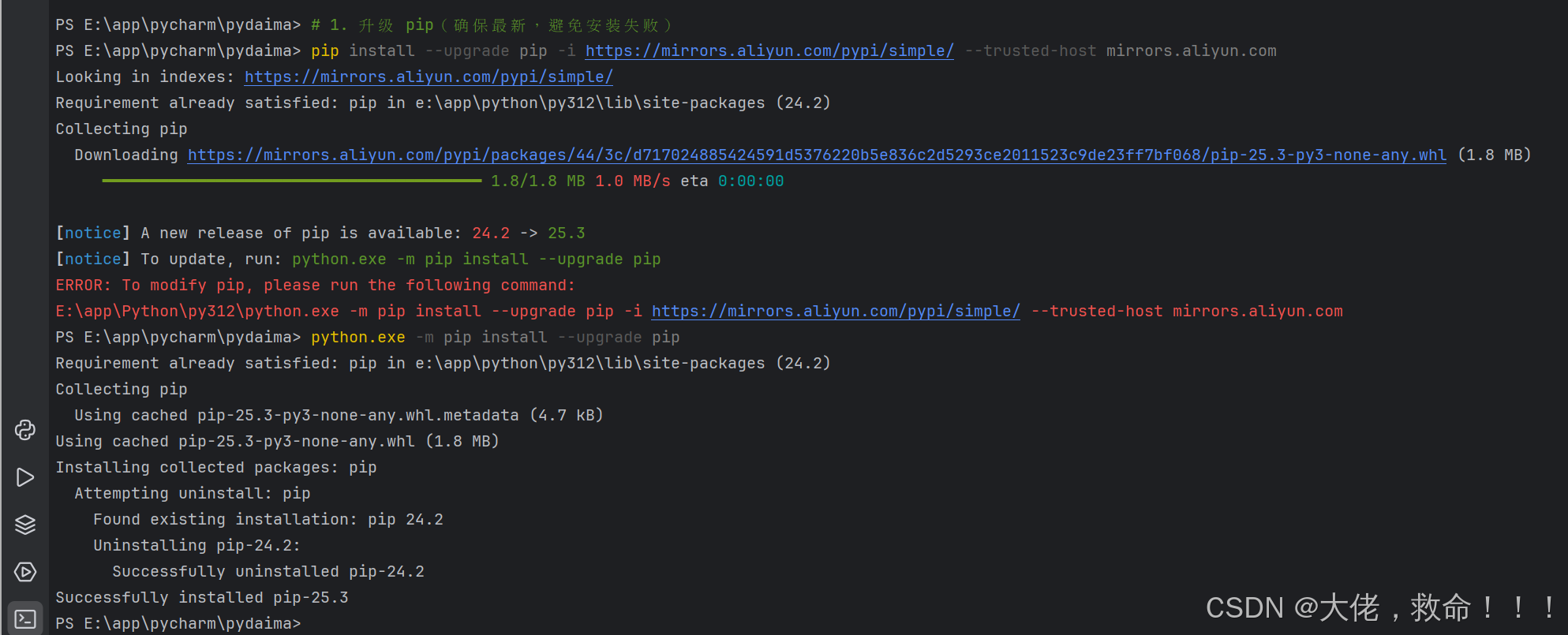 pip install --upgrade pip -i https://mirrors.aliyun.com/pypi/simple/ --trusted-host mirrors.aliyun.com