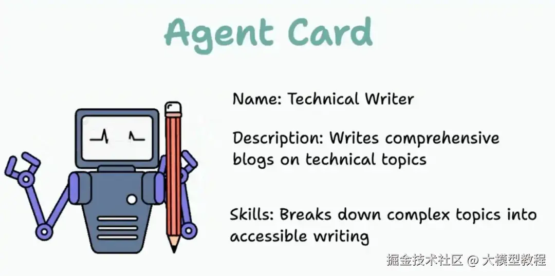 - Agent Card (身份卡片) : 这是 Agent 的"名片"或 JSON 元数据文件。它声明了 Agent 的身份、能力(Capabilities)、支持的输入格式以及认证方式。Client Agent 通过读取 Server Agent 的 Card 来决定是否将任务委派给它。