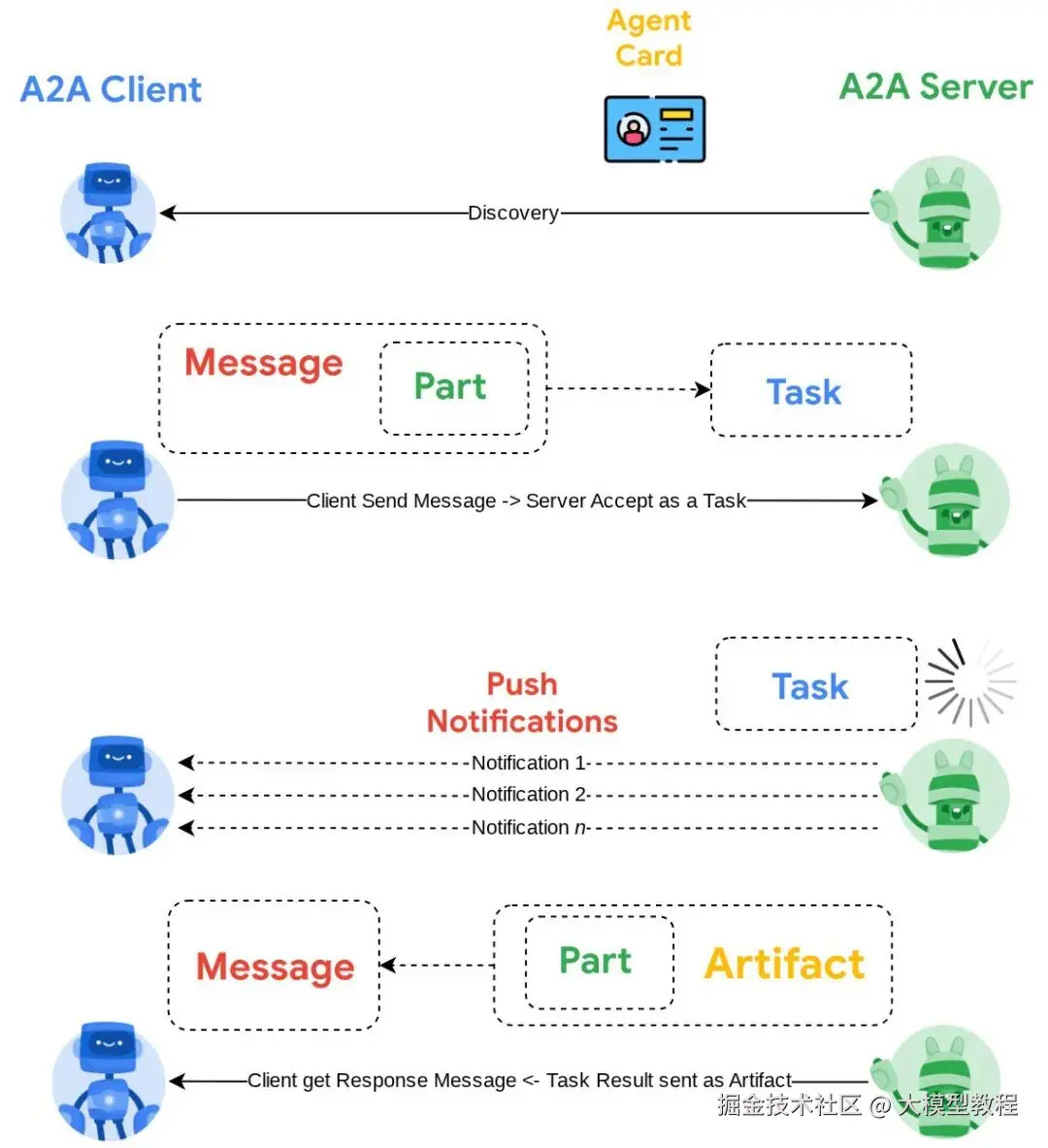 Message & Artifact (消息与工件): Agent 之间不仅交换对话(Message),还交换结构化的产出物(Artifact)。例如,一个"旅行规划 Agent"完成任务后,返回的不仅仅是一句"做好了",而是一个包含航班信息、酒店预订号的结构化 JSON Artifact。