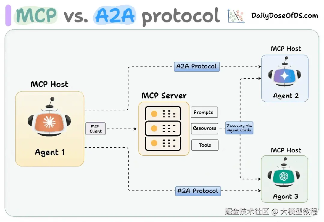| 核心目标 | 连接模型与上下文(数据/工具) | 连接 Agent 与 Agent(协作/分工) |