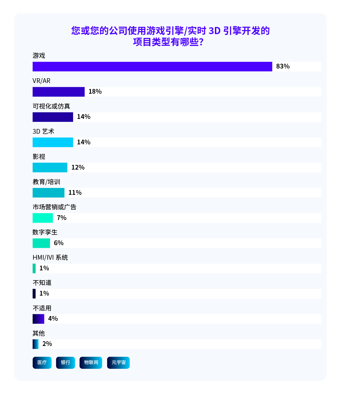 游戏引擎技术已从专用于游戏的软件演变为多行业通用的 3D 创作引擎,推动着各个领域的创新。我们的数据显示,跨行业采用率显著增长:18% 的受访者现在将游戏引擎用于 VR/AR(去年仅为 4%),14% 用于可视化与仿真(同样较去年的4% 有所增长),14% 用于 3D 艺术创作,12% 用于影视制作。
