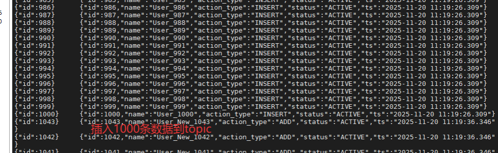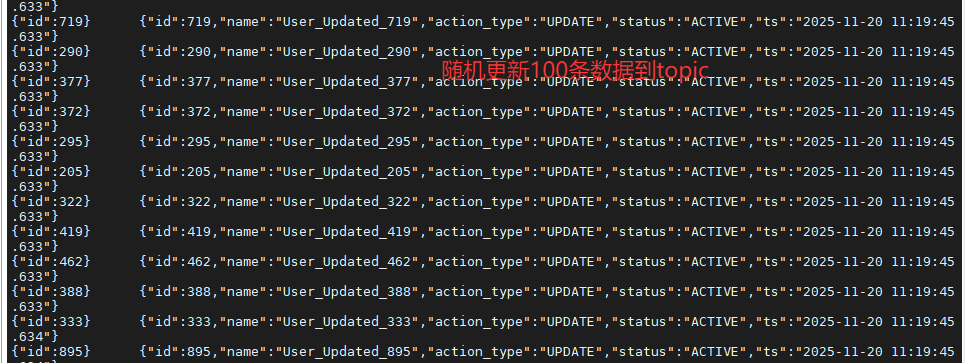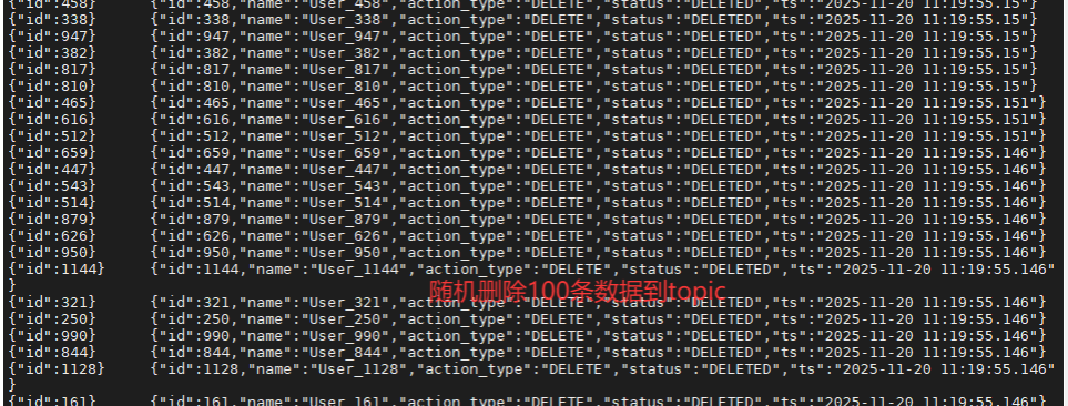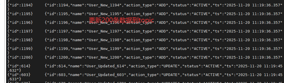 预期结果: 你会看到大量的 JSON 数据滚动,其中包含最新的 Update 和 Delete 操作记录(Key 相同的数据,后面的消息会覆盖前面的状态)。