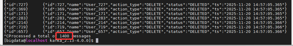 在 Kafka 节点(206)使用 kafka-console-consumer.sh 查看时,会发现 topic 中总共有 1400 条消息。 这是因为 Kafka 是基于日志(Log)的系统,所有操作都是"追加写入":