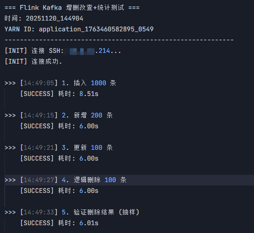 本测试旨在验证基于 CDH YARN 环境下的 Flink 集群与 Kafka 4.0 集群的连通性及流处理能力。通过本地 Python 脚本远程驱动 Flink SQL Client,使用 upsert-kafka 连接器模拟业务数据的 增(Insert)、删(Delete)、改(Update)、查(Select) 及 统计(Count) 操作,验证数据的一致性和状态更新机制。