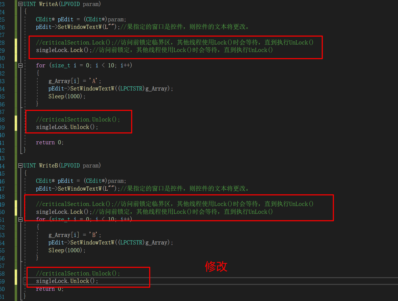 3)操作共享资源后,用singleLock.Unlock() 或 multiLock.Unlock() 解锁,让其他线程可以访问。