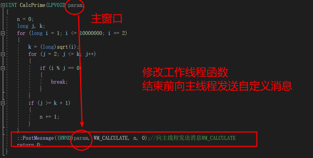 ::PostMessage((HWND)param, WM_CALCULATE, n, 0);//向主线程发送消息WM_CALCULATE