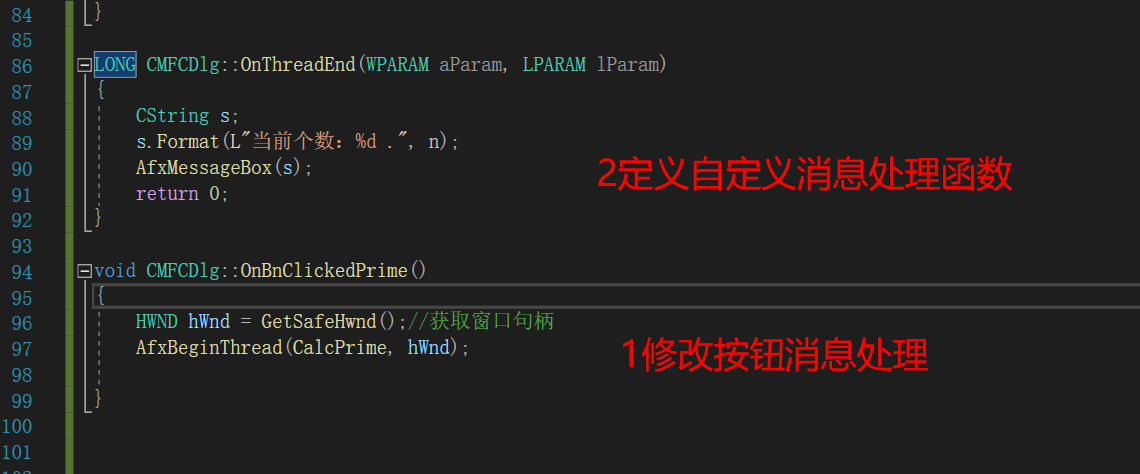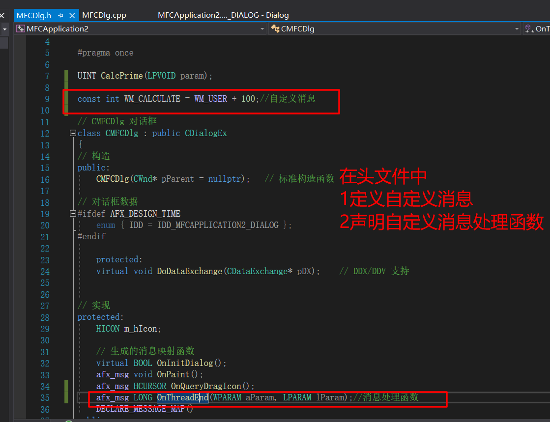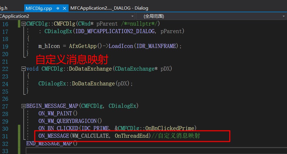 ON_MESSAGE(WM_CALCULATE, OnThreadEnd)//自定义消息映射