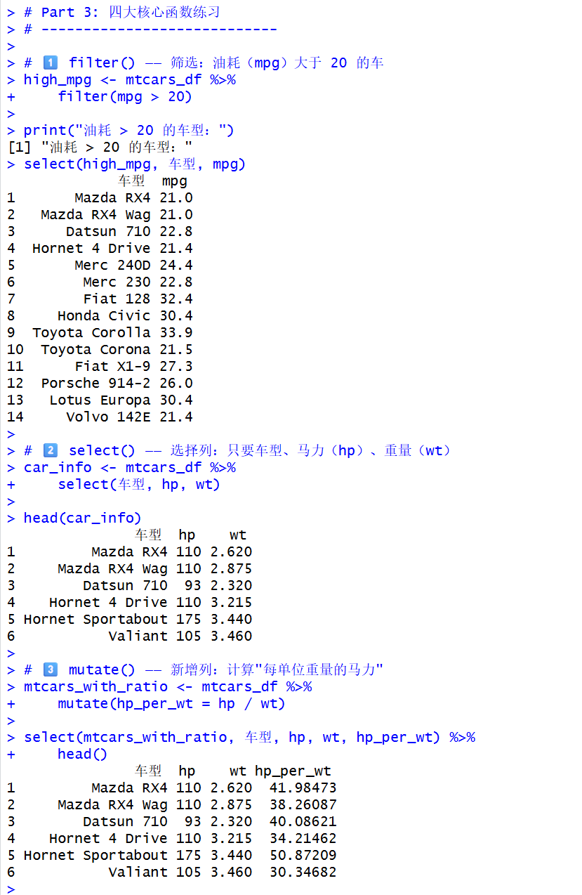 # 1️⃣ filter() ------ 筛选:油耗(mpg)大于 20 的车