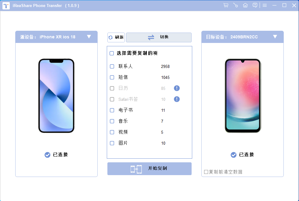 使用桌面工具可以更稳定地将 iPhone 数据传输到 Android 设备。如果您已在新 Android 手机上完成设置,或者目标 Android 设备并非全新且存储了大量重要数据,则可以使用iReaShare Phone Transfer来复制联系人。该工具还可以传输照片、视频、音乐、短信和电子书。联系人传输完成后,两台设备上的数据都不会丢失。