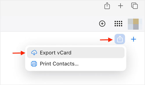 在电脑上,访问 iCloud.com 并登录。然后点击"通讯录 ",点击右上角的箭头图标 ,选择"全选 ",然后选择"导出 vCard "。这将下载一个 .vcf 文件。