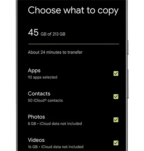登录您的 Google 帐户,然后选择"通讯录 "以及您想要复制的其他数据。点击"复制"开始复制过程。完成后,您就可以在新 Android 手机上访问 iPhone 通讯录了。