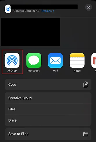 向下滚动并点击"共享联系人 ",然后选择"邮件"(或其他电子邮件应用)。将邮件发送给自己,联系人将以 .vcf 文件附件的形式发送。
