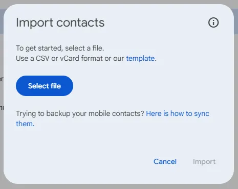 前往 contacts.google.com,并使用您在 Android 手机上使用的 Google 帐户登录。在左侧边栏中,点击"导入 ">"选择文件 "选择您刚刚下载的 .vcf 文件,然后点击"打开 ">"导入"。