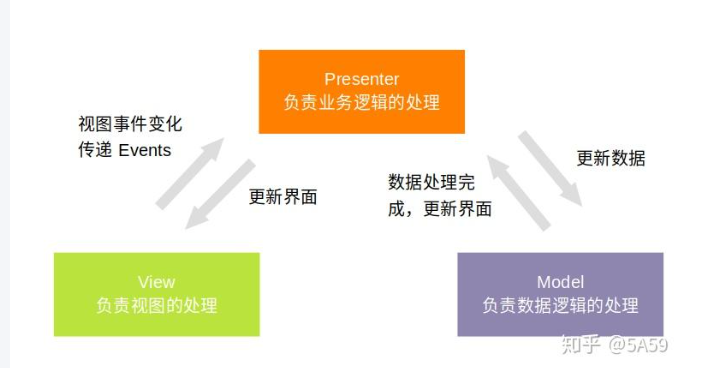 用户触发事件(点击按钮,输入文本)->view收到点击事件之后交给p层->p层做出业务逻辑处理->如有需要,把数据传递给Model->Model更新、储存、获取数据->将结果返回给P层->p层更新UI