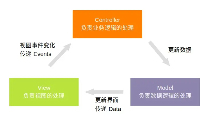 view产生事件,然后通知给controller, controller作逻辑的处理,然后把数据通知给model,最后model进行数据的处理,最后通知给view更新UI;