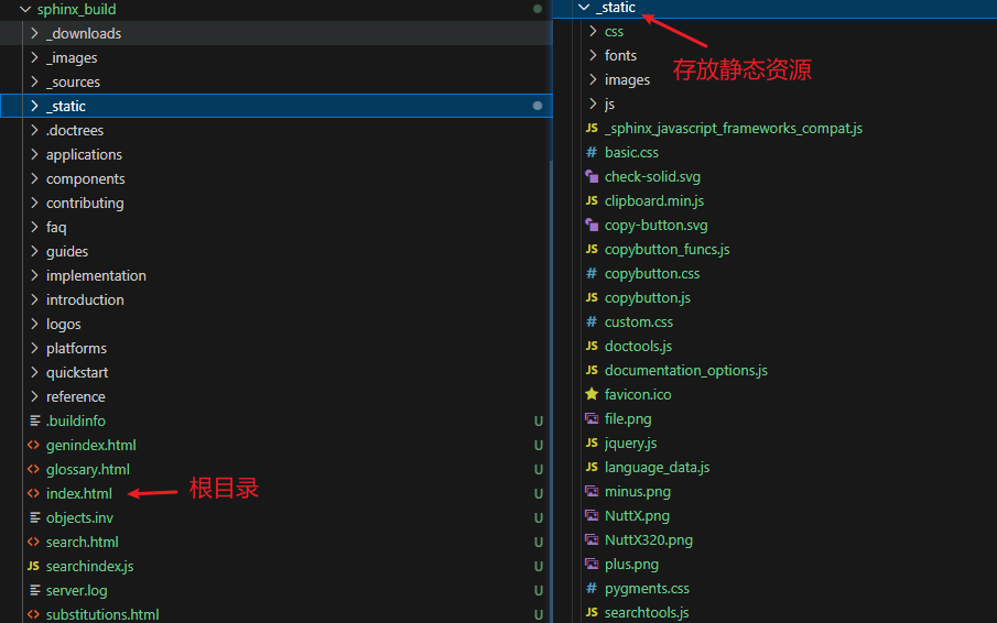 所以总结一下,Sphinx 构建打包成功后,会生成一个完整的纯静态网站 (从服务器上看就是一个文件夹),里面存放着包括 index.html,*.css,*.js,图片等资源,内部链接都是相对路径或绝对路径(相对于站点根),这些文件不需要服务端处理,只要能通过 HTTP 正确返回文件内容即可