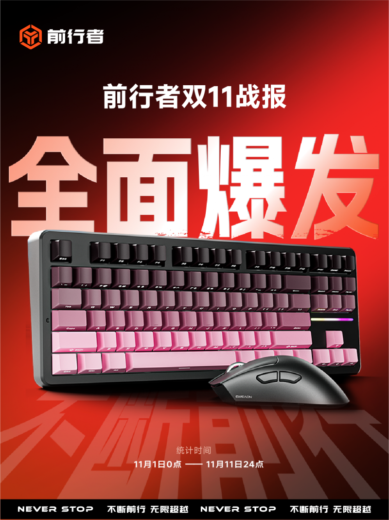 2025年双11刚刚落下帷幕,国产外设品牌前行者(EWEADN)交出了一份亮眼的成绩单------其多款旗舰产品在抖音、天猫、京东三大平台实现全域霸榜,并一举获得"2025抖音电商最具影响力品牌奖"。