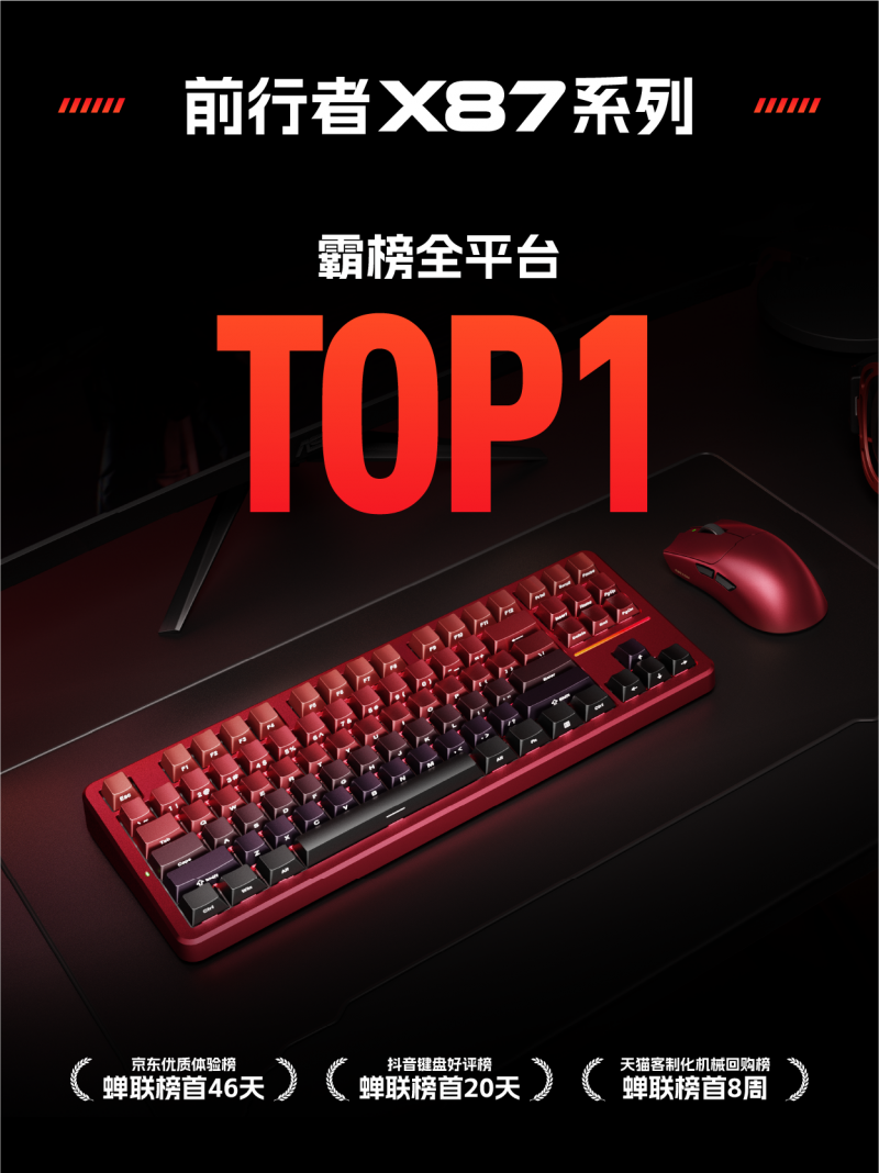 此外,前行者X87系列键盘一举拿下键盘"京东优质体验榜TOP1"、"抖音键盘好评榜TOP1"和"天猫客制化回购榜TOP1"三项榜首。