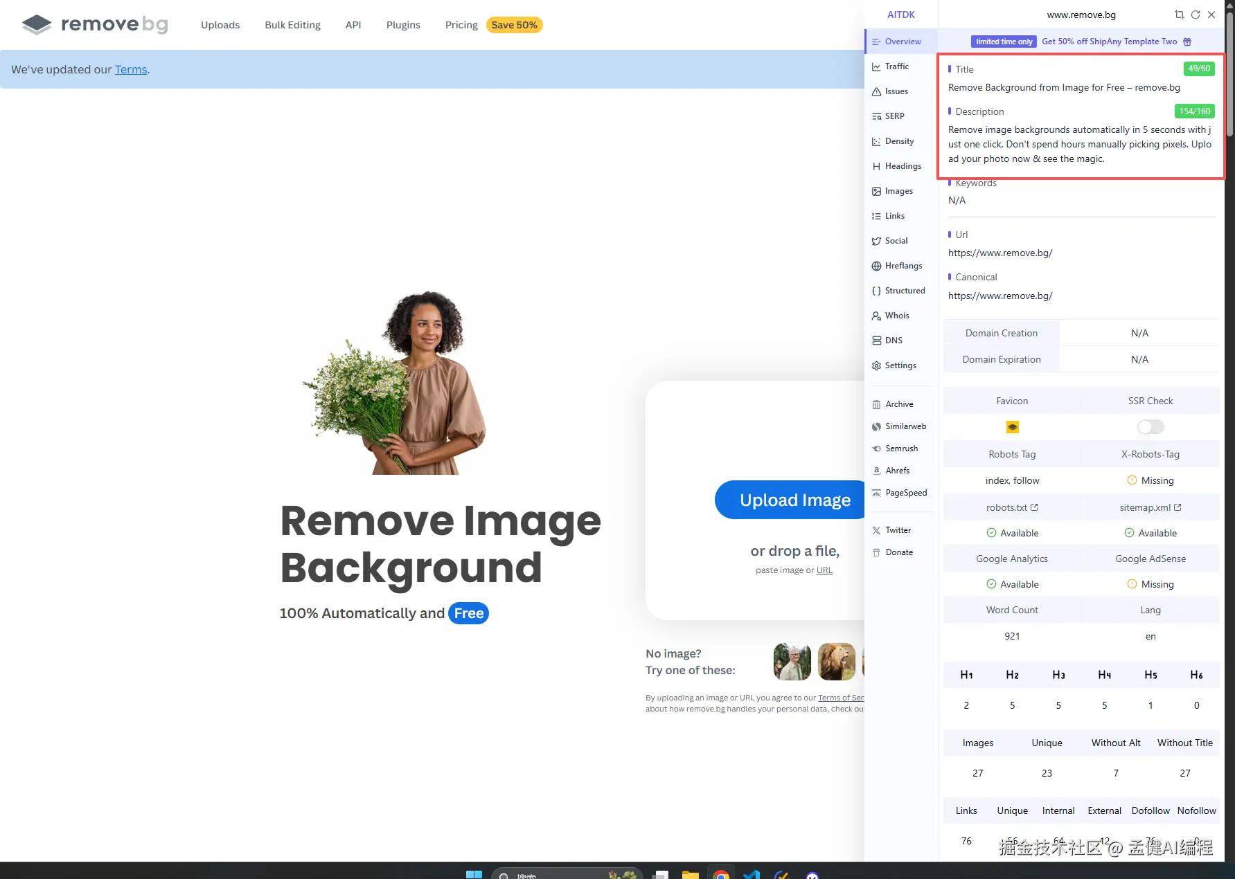 它的标题,首先描述的主功能 Remove Background,然后抛出了一个 Free 的钩子,增加 serp 吸引力。