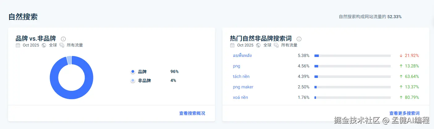 从 SimilarWeb 上可以看到,它的品牌词占比 96%,而它的品牌词就是需求词,基本上在这个词上就是垄断了。