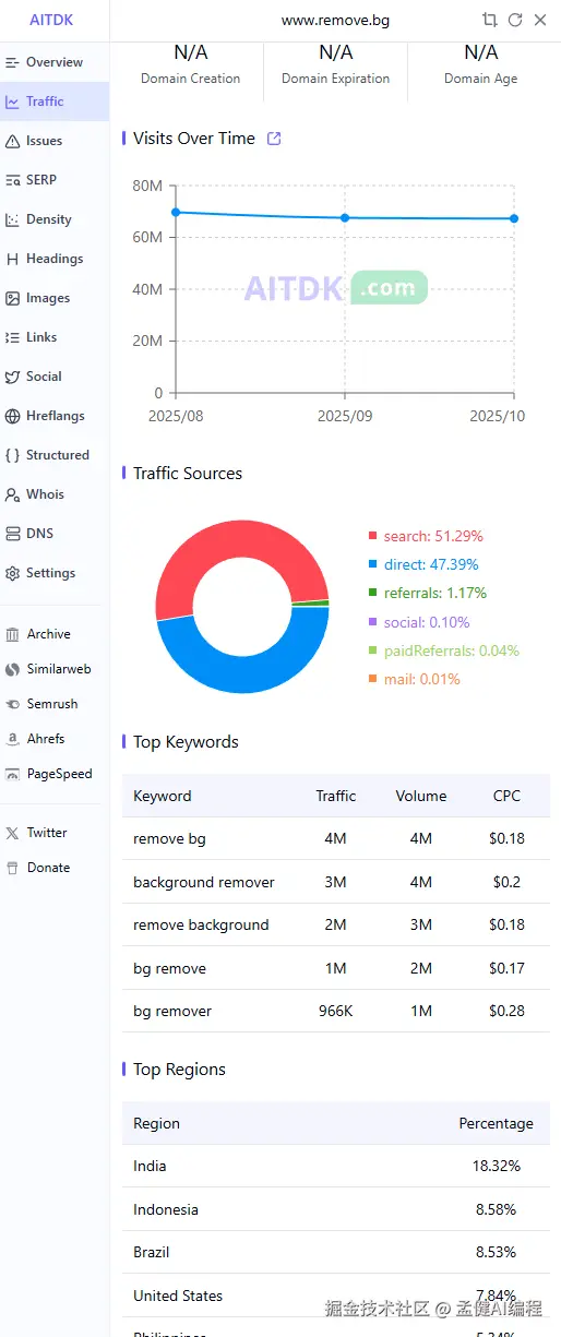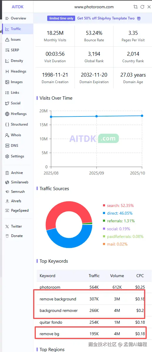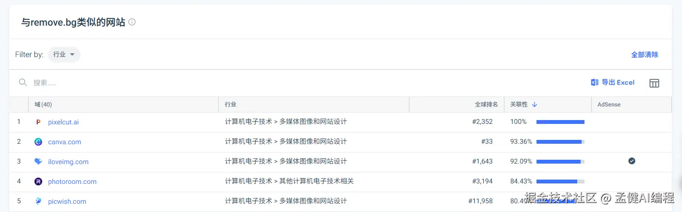 这说明什么?就算 remove.bg 已经非常厉害了,但这个市场盘子足够大,依然有其他的竞争者可以分到流量。