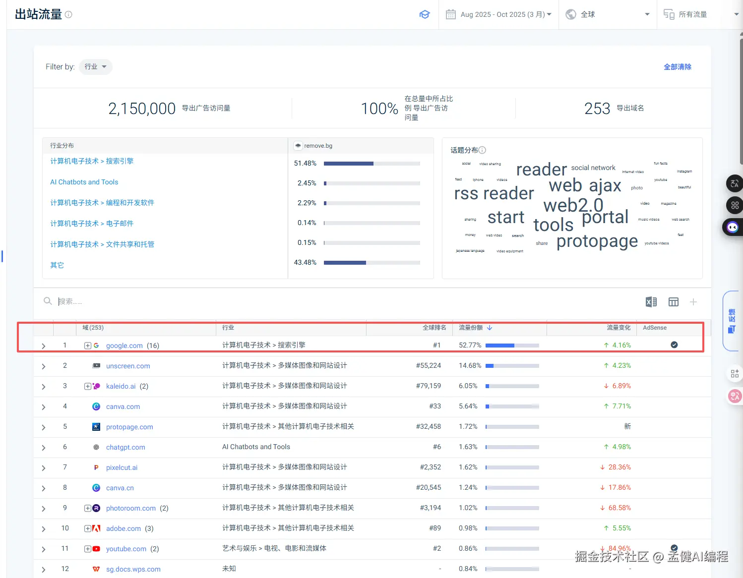 出站流量第一名是 google,大概率是 adsense 广告了,不知道为什么他们现在去掉了广告。
