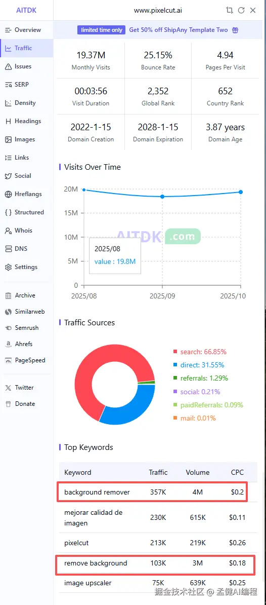 比如 pixelcut,这个站点有两千万的访问量,我们看它的搜索词: