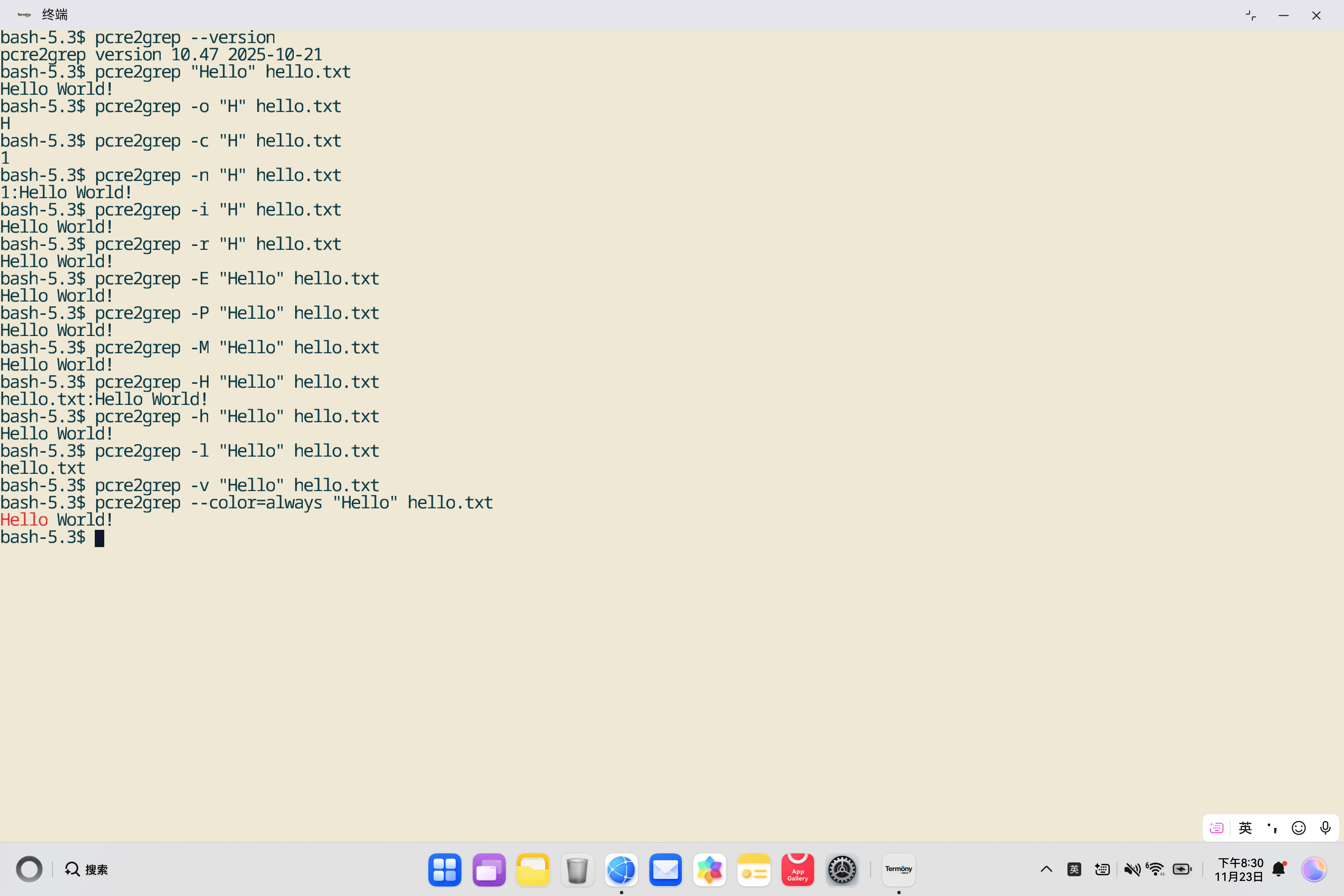 pcre2grep- 类似grep的正则表达式搜索工具pcre2test- 正则表达式测试和调试工具pcre2-config- 配置信息查询工具