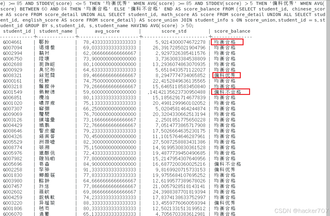 SELECT s.student_id, s.student_name, AVG(score) AS avg_score, STDDEV(score) AS score_std, CASE WHEN AVG(score) >= 85 AND STDDEV(score) <= 5 THEN '均衡优秀' WHEN AVG(score) >= 85 AND STDDEV(score) > 5 THEN '偏科优秀' WHEN AVG(score) BETWEEN 60 AND 84 THEN '均衡合格' ELSE '偏科不合格' END AS score_balance FROM (SELECT student_id, chinese_score AS score FROM score_detail UNION ALL SELECT student_id, math_score AS score FROM score_detail UNION ALL SELECT student_id, english_score AS score FROM score_detail) AS score_union JOIN student_info s ON score_union.student_id = s.student_id GROUP BY s.student_id, s.student_name HAVING AVG(score) > 50;