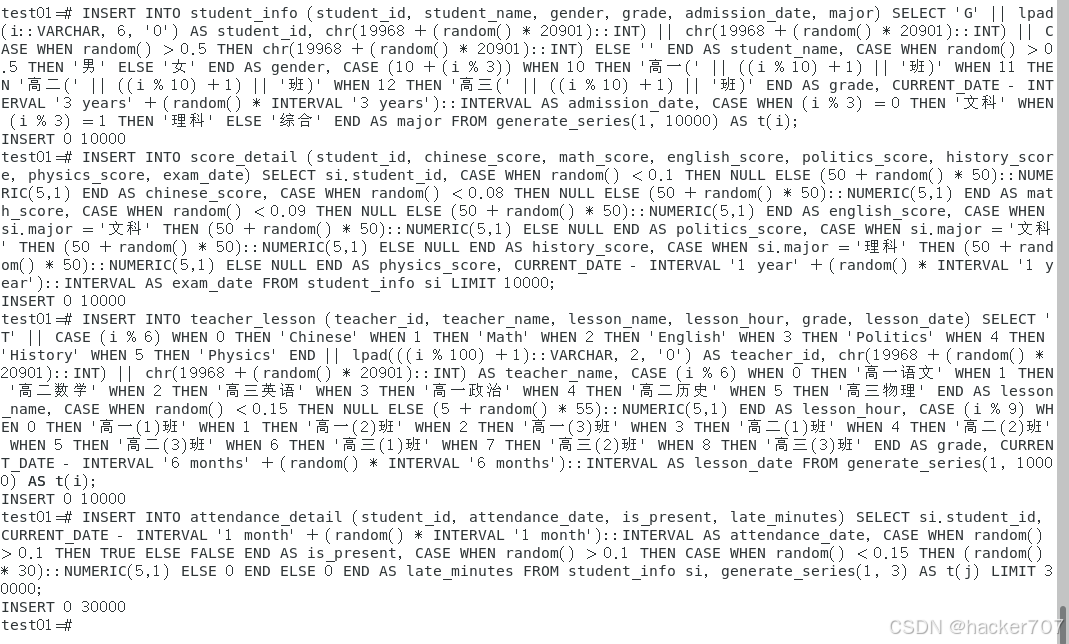 以下代码通过openGauss内置函数(如generate_series、random、chr等)生成符合K12场景的数据:1万条学生信息(覆盖高中学段3个年级、10个班级)、1万条成绩记录(含主科与文理科选考科目)、1万条教师授课记录(匹配各学段科目)及3万条出勤记录(每人每月3条出勤数据),数据分布贴合K12教育实际情况(如文科学生生成政治历史成绩,理科学生生成物理成绩)