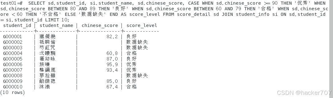 基于K12成绩分级需求,验证openGauss对SQL99标准中CASE WHEN基础语法的兼容度,包括简单条件判断、多条件分支及默认值设置,解决K12场景中"成绩等级明确划分"的基础需求。