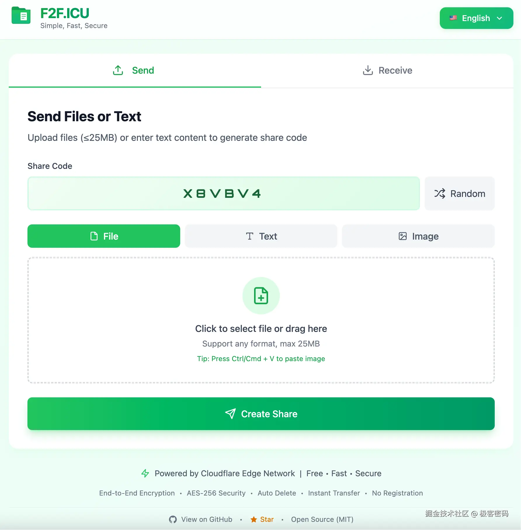 - 发送方:生成一个 6 位分享码 → 上传文件/文本 → 把码给对方