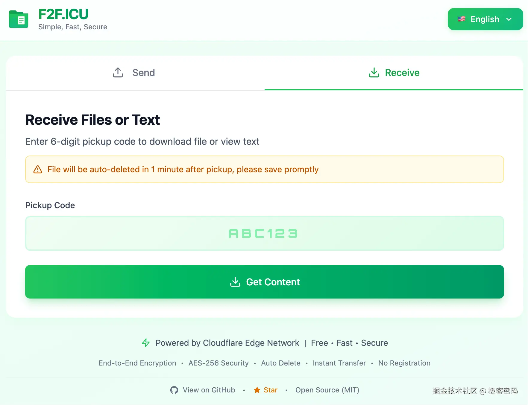 - 接收方:输入 6 位取件码 → 一键下载